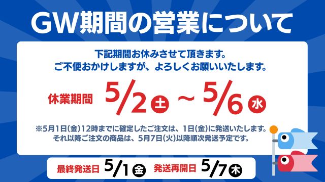 4月25日(土)から5月6日(休)のゴールデンウィーク期間中はカレンダー通り、