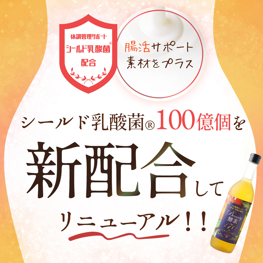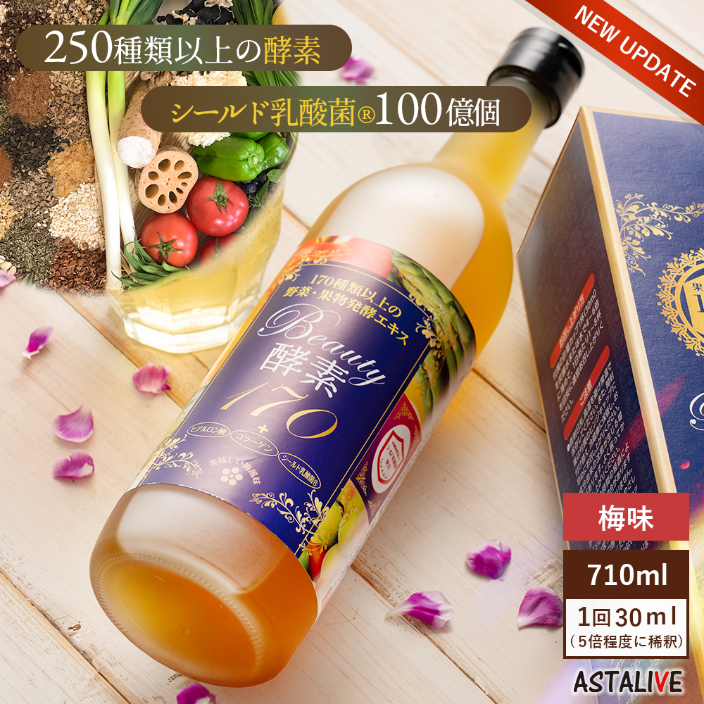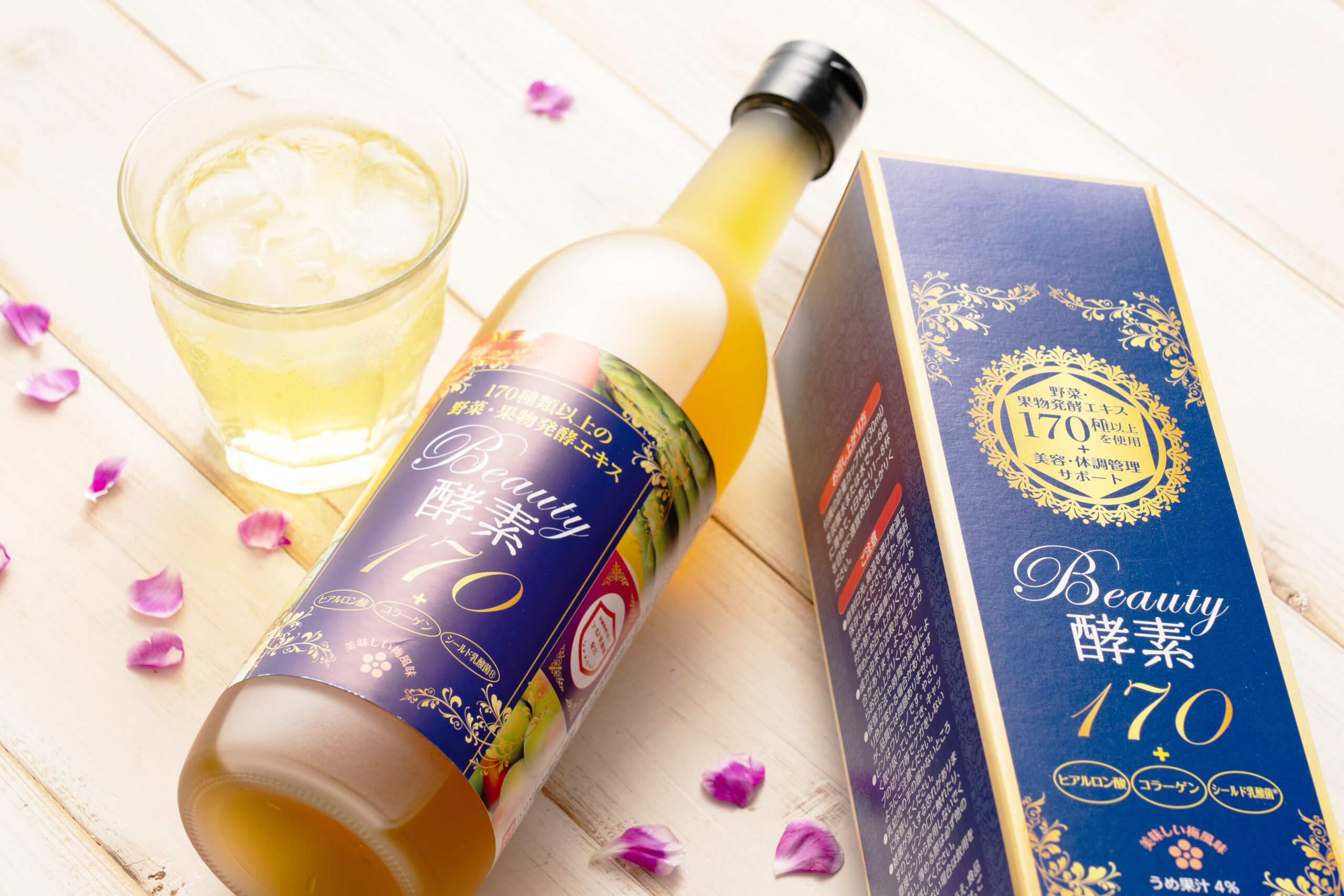 マルチトールシラップ(国内製造)、植物発酵エキス末(卵・オレンジ・カシューナッツ・キウイフルーツ・ごま・大豆・バナナ・やまいも・りんごを含む)、うめ濃縮果汁、植物発酵エキス、フィッシュコラーゲンペプチド(ゼラチンを含む)、乳酸菌粉末(殺菌)、エリスリトール、オリゴ糖シラップ、イヌリン/酸味料、安定剤(ペクチン)、香料、甘味料(ステビア)、ヒアルロン酸、保存料(安息香酸Na)、ナイアシン、ビタミンB6、ビタミンB1、ビタミンB2